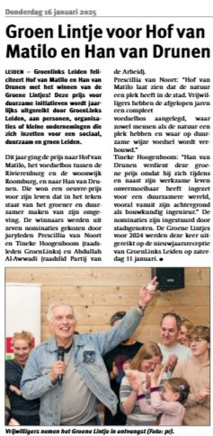 Op zaterdagmiddag 11 januari werd Voedselbos Hof van Matilo beloond met het Groene Lintje. Dit Groene Lintje is een initiatief van de Leidse afdeling van GroenLinks, en is bedoeld om vergroenende initiatieven in het zonnetje te zetten. Uit de genomineerden koos de jury Hof van Matilo als winnaar. "Hof van Matilo laat zien dat de natuur een plek heeft in de stad. Vrijwilligers hebben de afgelopen jaren een compleet voedselbos aangelegd, waar zowel mensen als de natuur een plek hebben en waar op duurzame wijze voedsel wordt verbouwd".